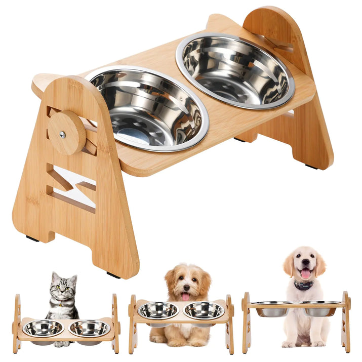 gegewawa Elevated Dog Bowls Stand with 6 Heights Options Adjustable Raised Dog Bowl Bamboo Pet Feeder for Small Sized Dogs and Cats with 2 18oz Stainless Steel Bowls Set and Non-Slip Mats