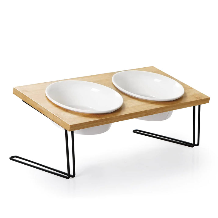 Sweejar Ceramic Elevated Cat Bowls Small Dog Bowls 15° Tilted Raised Pet Bowl with Solid Wooden Stand to Protect Spine Water and Food Feeder for Cat and Dog Pack of 2 (White)
